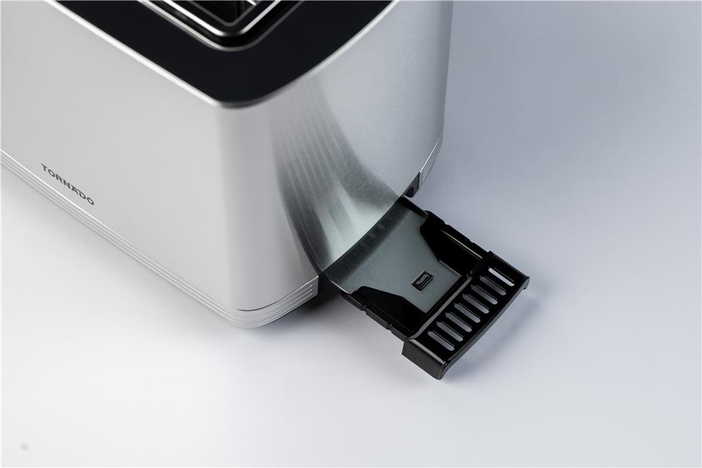 - Elegantno ohišje iz nerjavečega jekla z odstranljivim pladnjem za drobtine in prostorom za shranjevanje kabla